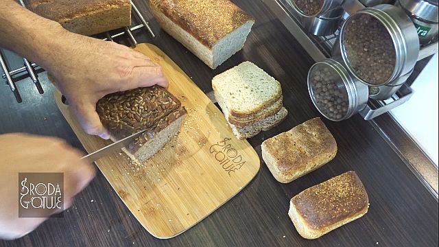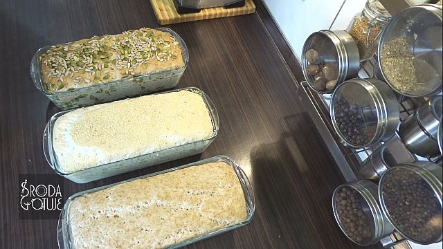 CHLEB ORKISZOWY Z ZIARNEM - 200 g mąki orkiszowej, - 100 g mąki żytniej, - 100 g mąki pszennej, - 8 g soli, - 30 g ziaren słonecznika, - 30 g ziaren dyni, - 30 g oleju rzepakowego, - 130 g zakwasu, - 200 g wody (45 st.C), - ziarna do posypania, CHLEB PSZENNY Z SEZAMEM - 350 g mąki pszennej, - 50 g mąki żytniej, - 8 g soli, 30 g oleju, - 130 g zakwasu, - 200 g wody (45 st.C), - sezam do posypania, CHLEB RAZOWY - 200 g mąki razowej, - 100 g maki żytniej, - 100 g mąki pszennej, - 8 g soli, - 30 g oleju, - 130 g zakwasu, - 200 g wody (45 st.C). WYMIARY FORMY: podstawa 8,5cm x 22cm, na górze 10cm x 25 cm. SPOSÓB PIECZENIA: po wyrośnięciu chleba włączyć piekarnik na 250 st. termoobieg. Pieczemy 15 - 18 min. natryskujemy nad chlebem w piekarniku wodą, pieczemy jeszcze 5 minut w 250 st. Po pięciu minutach zmniejszamy temp. do 200 st. Od tego momentu pieczemy 10 minut i natryskujemy ponownie, znowu pieczemy 5 minut. Wyjmujemy. Jeśli nie ma termoobiegu, należy wydłużyć każdy etap pieczenia przed natryskiwaniem o 3 do 5 minut.