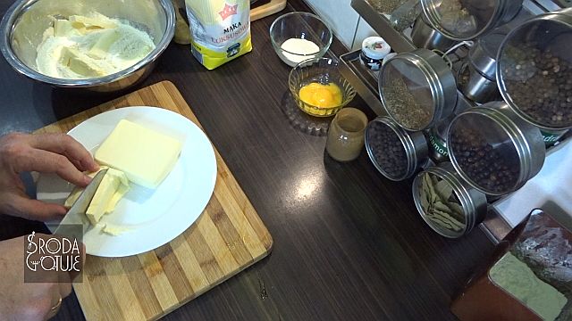 1. Wszystko naszykowane, więc zaczynamy od ciasta kruchego w proporcji 3:2:1. Twarde masło, prosto z lodówki, siekamy na kawałki wrzucając każdy do mąki tak aby się nie sklejały.