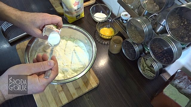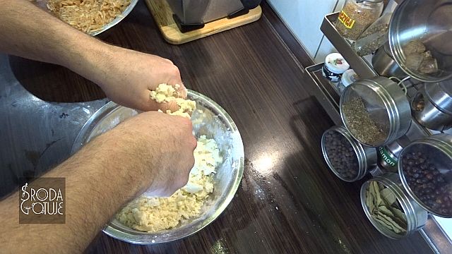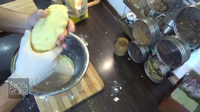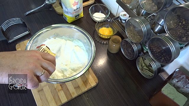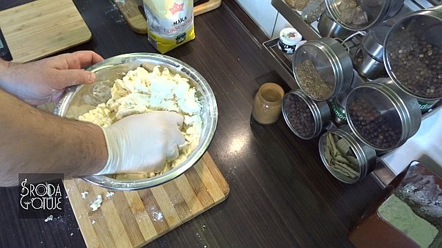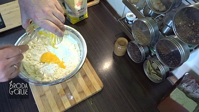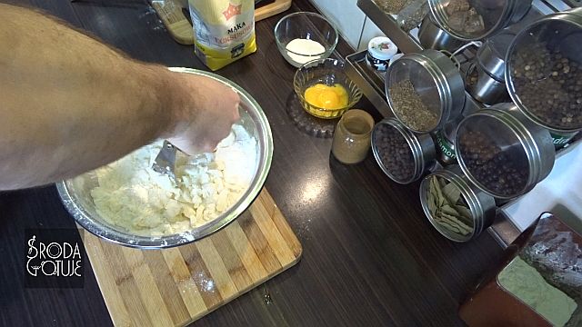 7. w końcu przyszedł czas aby ciasto wyrobić. Trzeba to zrobić rękoma. Jak tylko składniki połączą się tworząc zwartą masę kończymy ugniatanie.