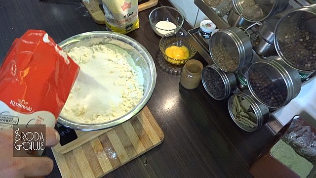 18. Przyszedł czas na kruszonkę. Do odważonej mąki siekamy masło dodajemy cukier i siekamy wszystko tak jak poprzedni ciasto kruche.