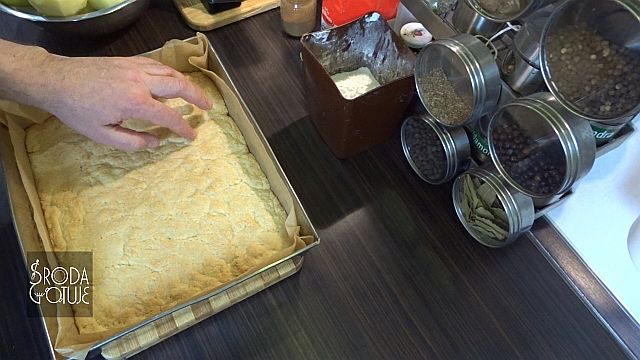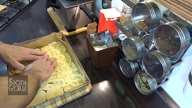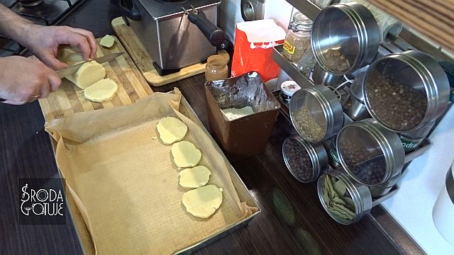 9. Wałek kroimy na plastry o grubości 5 - 8 mm i wykładamy nimi dno formy do pieczenia.