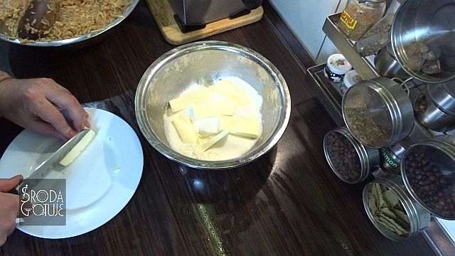 4. Teraz przy pomocy specjalnej siekaczki lub noża, siekamy masło razem z mąką na drobne kawałki.