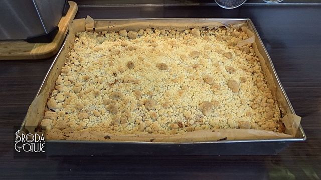 21. Całe ciasto posypujemy kruszonką, i pieczemy w 180 st. 1h z lub 1h i 15 minut bez termoobiegu. W całym domu pięknie pachnie, a ciasto po upieczeniu jest cudownie rumiane.