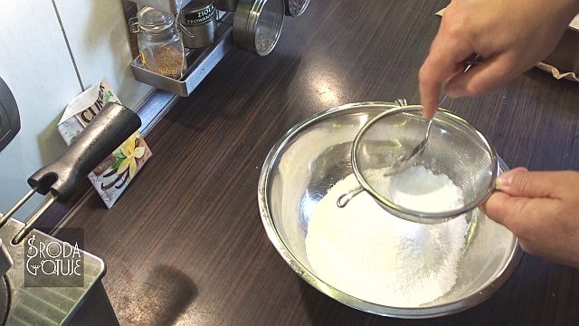 1. Na początku przygotowujemy kruche ciasto. Aby ciasto wyszło bardzo dobre należy zachować kilka ważnych zaleceń. Składniki na ciasto powinny być zimne, dlatego dobrze jest wcześniej odmierzyć 200 g mąki i 130 g masła posiekanego w paski oraz 80 g cukru pudru i wraz z 1 jajem umieścić wszystkie te składniki w lodówce co najmniej na 1 godzinę. Jak składniki są już zimne, to wsypujemy do miski składniki sypkie, tzn mąkę i cukier puder, który przesiewamy przez drobne sitko, aby pozbyć się ewentualnych grudek, dodajemy również 1 łyżkę cukru waniliowego.