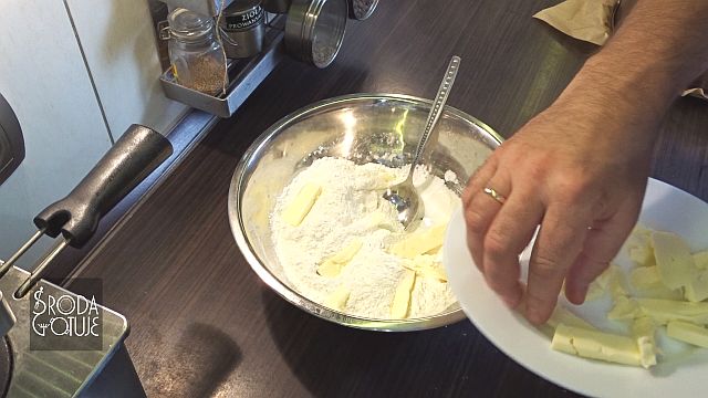 2. Teraz dodajemy zimne masło, wcześniej przygotowane na podłużne kawałki.