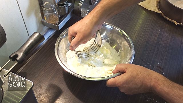 3. Trzeba teraz masło dokładnie rozdrobnić, aby można było je szybko zagnieść wraz z innymi składnikami. Można to zrobić nożem, jednak znacznie szybciej będzie za pomocą specjalnej siekaczki.