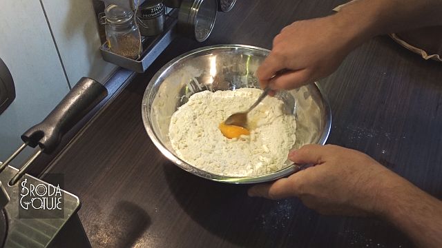 4. Wybijamy do ciasta żółtko z naszego jaja i mieszamy dokładnie za pomocą łyżki.