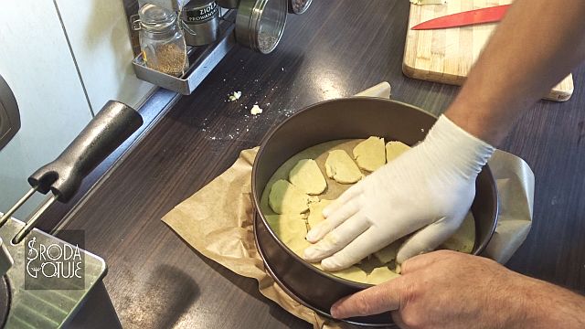 8. Rozkładamy cienkie plasterki na dnie tarty i wyklejamy dno.