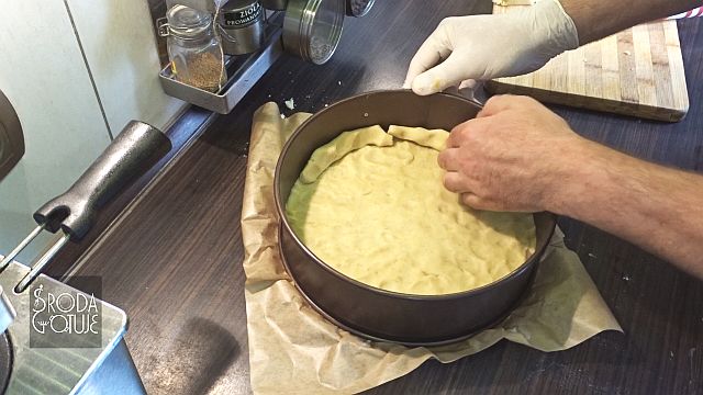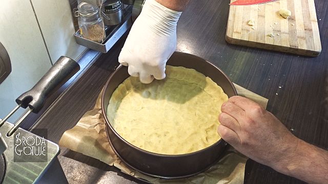 9. Teraz z grubszych plasterków formujemy długawe wałki i wyklejamy ranty tarty.