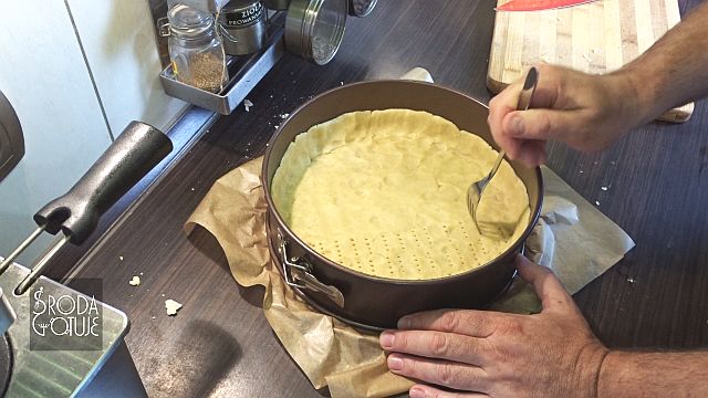 11. Teraz koniecznie należy całe dno nakłuć widelcem, aby ewentualne powietrze spod dna, nie podnosiło nam go, tylko ulotniło się przez dziurki.