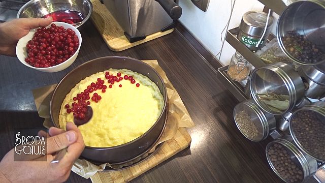 16. Na przestudzone ciasto wykładamy ciepły jeszcze budyń i pokrywamy go równomiernie porzeczkami.
