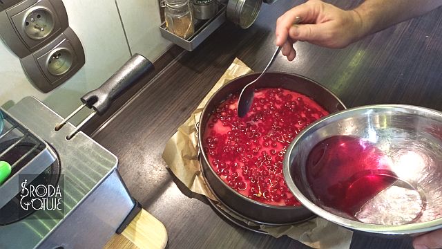 17. Jeśli galaretka jest juz mocno zimna i widać, że jest na krawędzi zastygnięcia (objawia się to np. zastyganiem jej na brzegach miski), wylewamy ją delikatnie za pomocą łyżki na całą tartę. Po tej operacji, trzeba tartę schłodzić co najmniej kilka godzin w temp. poniżej 10 st.