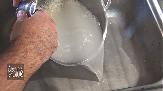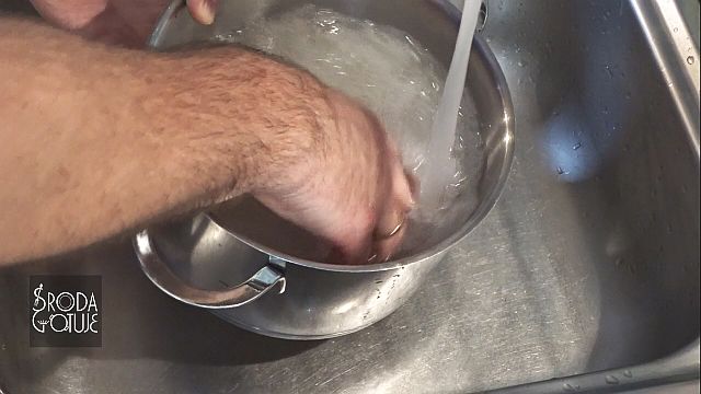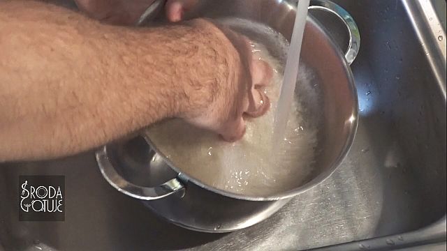 2. Po kilkunastu sekundach szybko wylewamy wodę, uważając aby ryż nie uciekał.