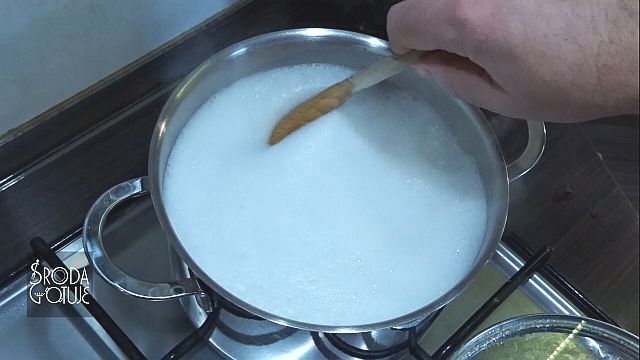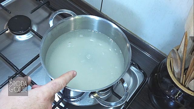 4. Zalewamy 3/4 garnka wodą, solimy i dodajemy szczyptę kwasku. Włączmy palnik i pod przykryciem zagotowujemy. Musimy być czujni i uważać aby nam nie wykipiał.