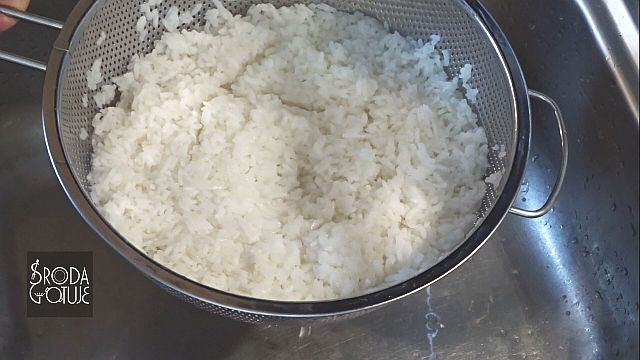 6. Gdy ryż będzie dobry, a możemy zrobić miękki, albo aldente (po prostu trzeba spróbować) cedzimy go na sicie przelewając szybko zimną wodą, to zapobiegnie dalszemu, samoczynnemu gotowaniu się.