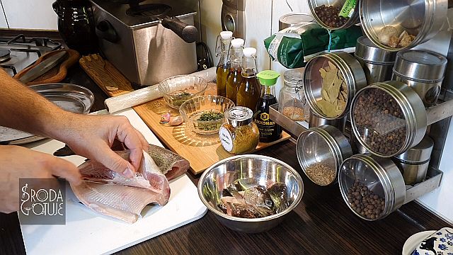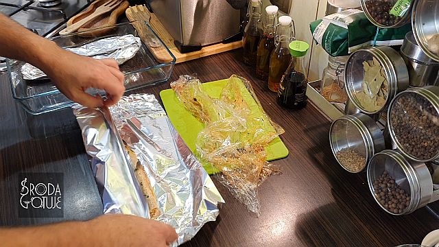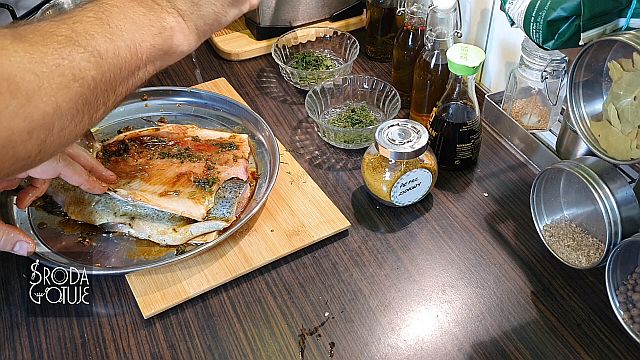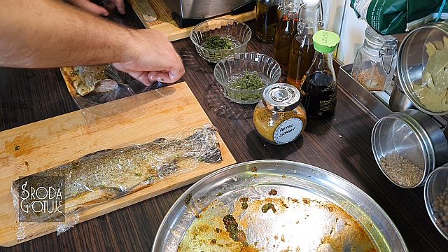 7. Teraz zawijamy pstrągi szczelnie w folię spożywczą i wkładamy do lodówki na noc . Niech leżą, aż przyjdzie na nie pora obiadowa. Koniecznie muszą się zamarynować przez kilkanaście godzin.