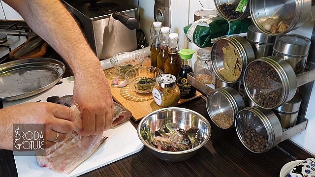 2. Teraz najważniejsza operacja, wykrajamy ości wraz z kręgosłupem. Najlepiej zobaczyć to na filmie. Ości są praktycznie na wierzchu, są pokryte jedynie cienką błoną. Małym nożykiem zaczynamy od strony głowy i zaraz pod ościami nakrajamy w stronę ogona, w taki sposób aby wykroić jak najmniej mięsa. Najpierw jedna strona, potem druga.