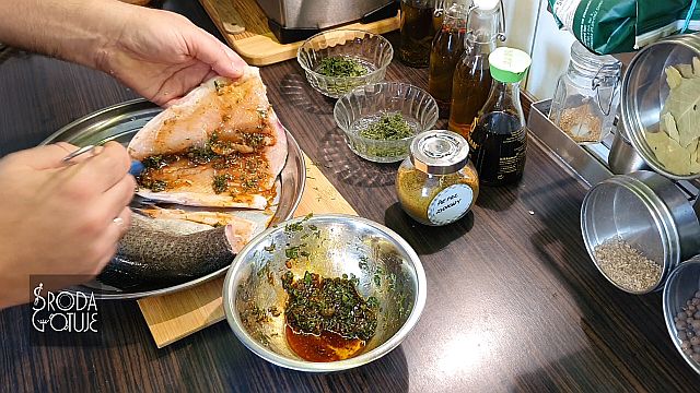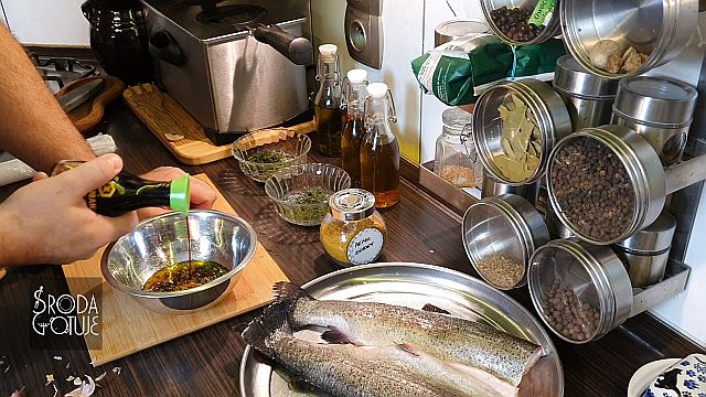 5. Smarujemy dokładnie pstrągi w środku, starając się równomiernie rozmieścić zioła.
