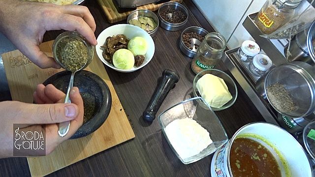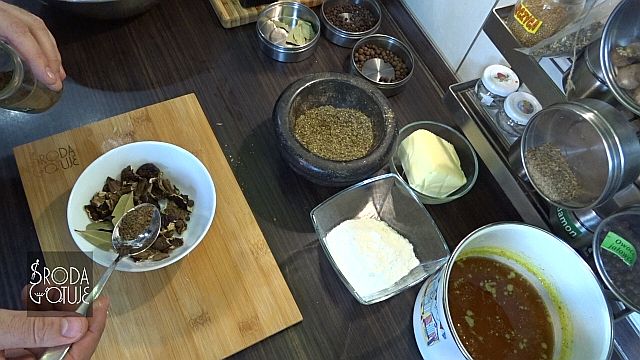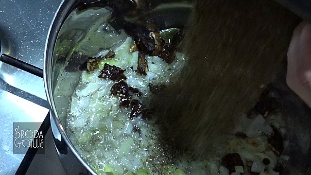 6. W między czasie przygotowujemy resztę przypraw: grzyby, liść laurowy, ziele angielskie i kminek.