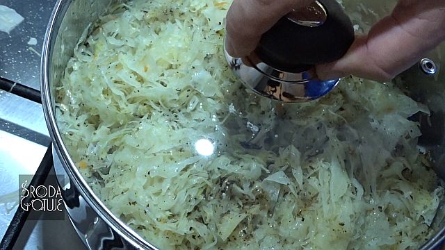 9. Dusimy kapustę wraz z przyprawami pod przykryciem około 5 minut, co minutę mieszając (bez wody).