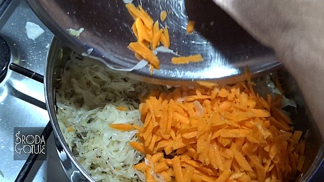 10. Ścieramy marchew na tarce jarzynowej o grubych okach i dodajemy do kapusty, mieszamy. Chwilę dusimy dwa razy mieszając.