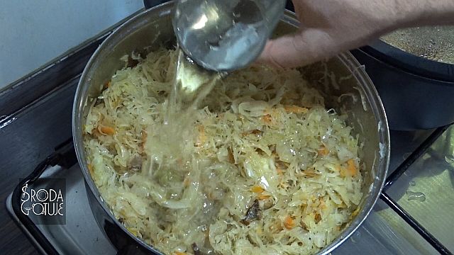 12. Kapusta musi być wilgotna, dlatego dopełniamy kapustę wodą w takiej ilości aby woda była widoczna po naciśnięciu łyżką, mniej więcej 1-2 cm poniżej poziomu kapusty, taki stan płynu utrzymujemy przez całe gotowanie. Przykrywamy i gotujemy kapustę do miękkości - al'dente.