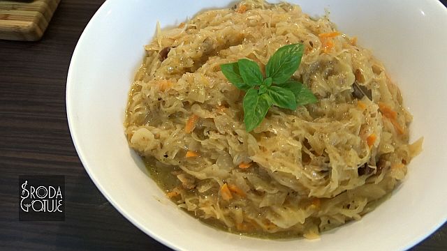 Bardzo dobra, prawdziwie polska kiszona kapusta, odpowiednio przyprawiona, po prostu wspaniała: - 2 do 2,5 kg jesiennej kapusty kiszonej - 2 marchewki - 100 g smalcu - 150 g masła śmietankowego lub extra - 4 czubate łyżki mąki pszennej - 2 średnie cebule - garść suszonych grzybów - 0,5 l mocnego bulionu (wołowo/drobiowy) - 2 łyżki majeranku - 1 płaska łyżeczka pieprzu mielonego - 5 do 10 ziaren ziela angielskiego - 3 liście laurowe - 1/2 łyżeczki ziaren kminku