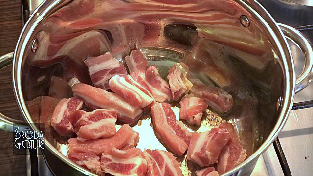 2. Na dnie rozgrzanego garnka układamy, pokrojony w szerokie paski, brzuch i smażymy go na lekko rumiano. W początkowej fazie smażymy na jednej stronie, a po kilku minutach przewracamy kawałki na drugą stronę.
