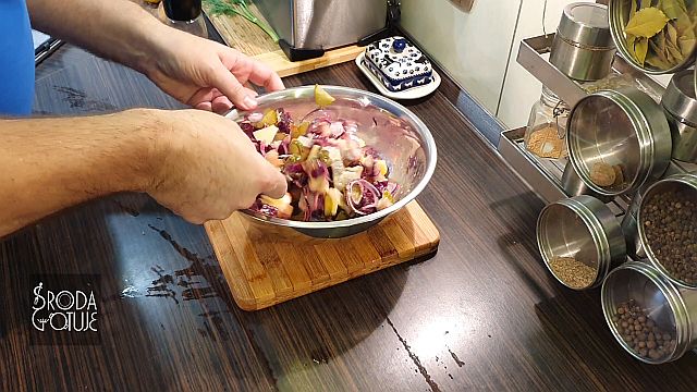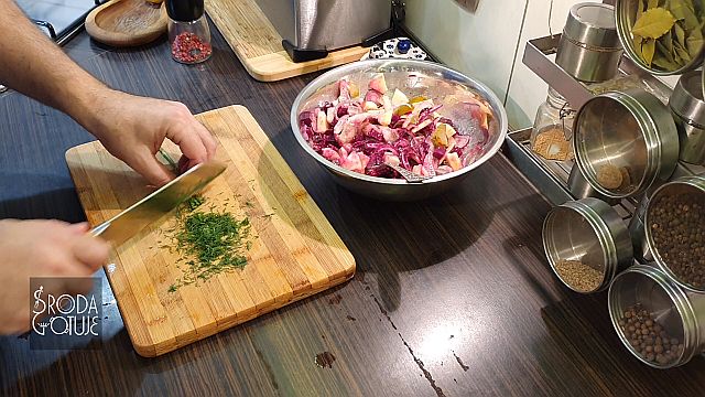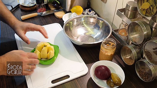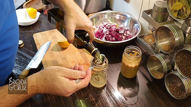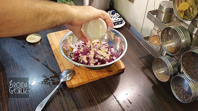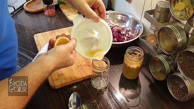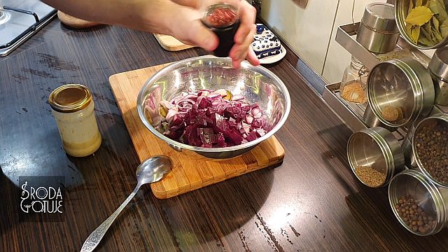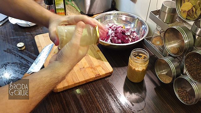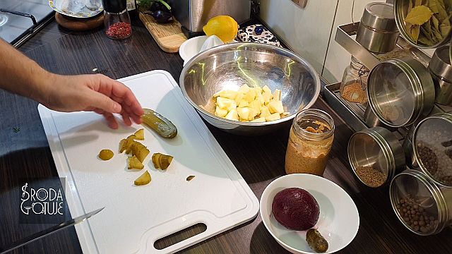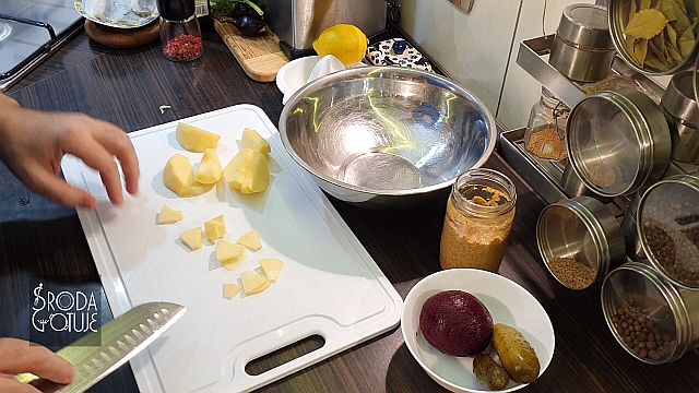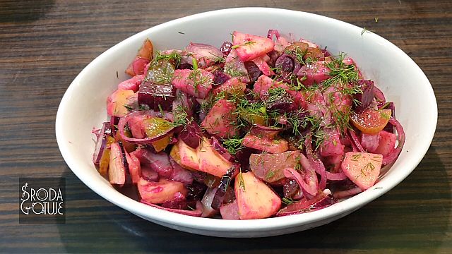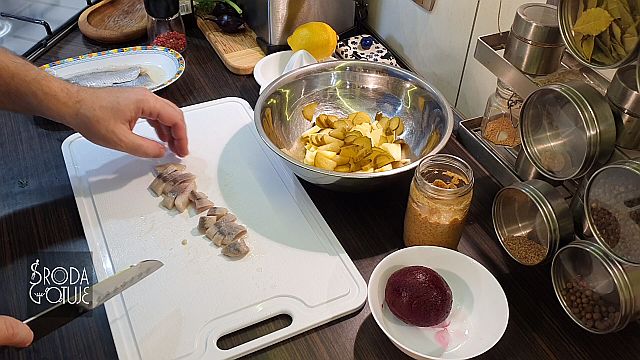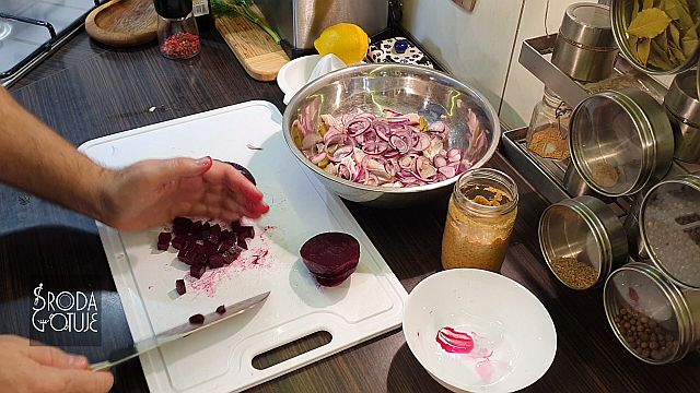 Doskonale dobrane smaki, jest słonawo, kwaśno i słodko: - 3 - 4 płaty śledziowe ala matyjas - 1 średni gotowany burak - 1 średnie kwaskowe jabłko - dwa średnie ogórki kiszone - 1 lub dwie cebule czerwone - trochę koperku zielonego - pieprz kolorowy do smaku SOS - sok z połowy cytryny - 6 łyżek dobrego oleju rzepakowego - 1 łyżka musztardy