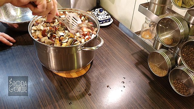 13. Można dodawać grzyby. Smażymy 2 minuty razem z cebulą.