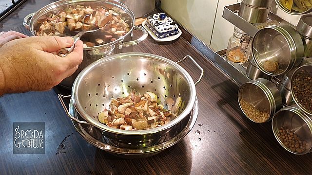 4. Teraz łyżką cedzakową, wyjmujemy delikatnie na durszlak. Grzyby muszą postać, aby się odsączyły. Można je też wystudzić i przechować w lodówce kilka dni lub spakować porcję do zamrażarki i wykorzystać w innym terminie.