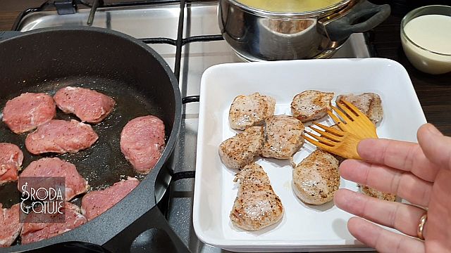 7. Na rondlu o grubym dnie topimy 1 łyżkę smalcu. Smażymy polędwiczki bardzo krótko, po 1 minucie na każdej stronie. Smażymy na dwa razy, aby na rondlu było luźno.