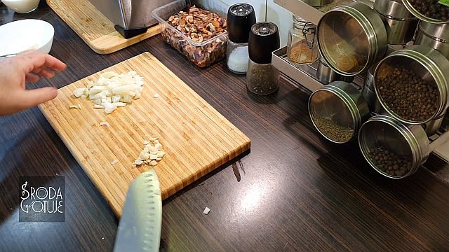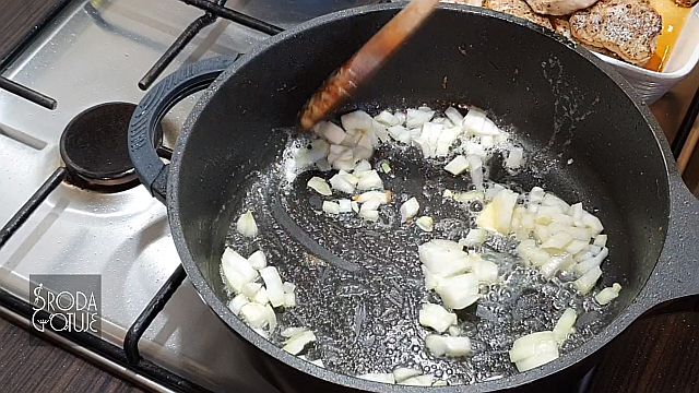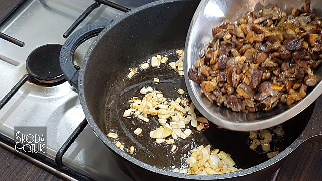 12. Zdejmujemy grzyby i dokładamy łyżkę masła, aby usmażyć cebulę i czosnek. Najpierw cebula przez kilka minut, aż stanie się złocista i wtedy na minutę dodajemy czosnek.
