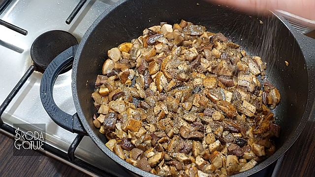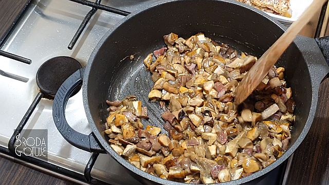 10. Smażymy grzyby. Całkowite smażenie grzybów to 10 minut, powinno wystarczyć.