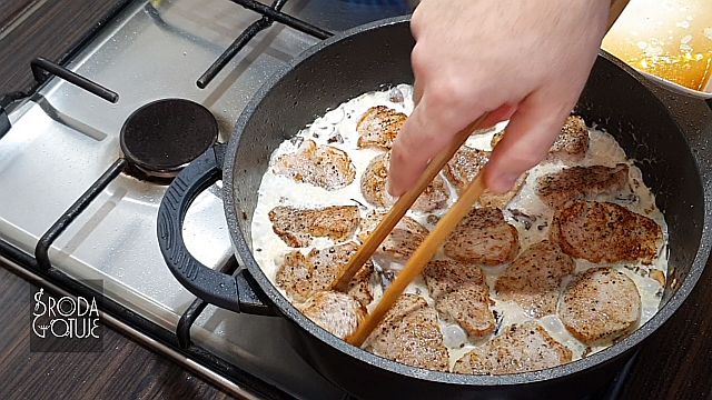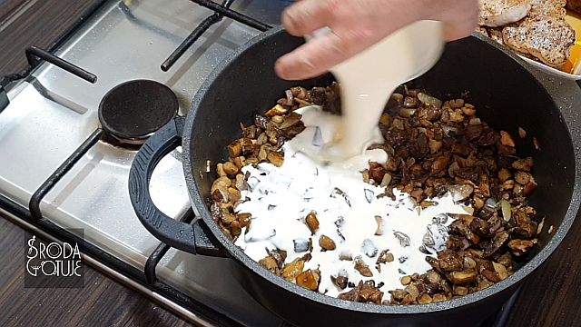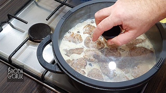 14. Zalewamy grzyby śmietaną i dusimy pod przykryciem do zagotowania się.